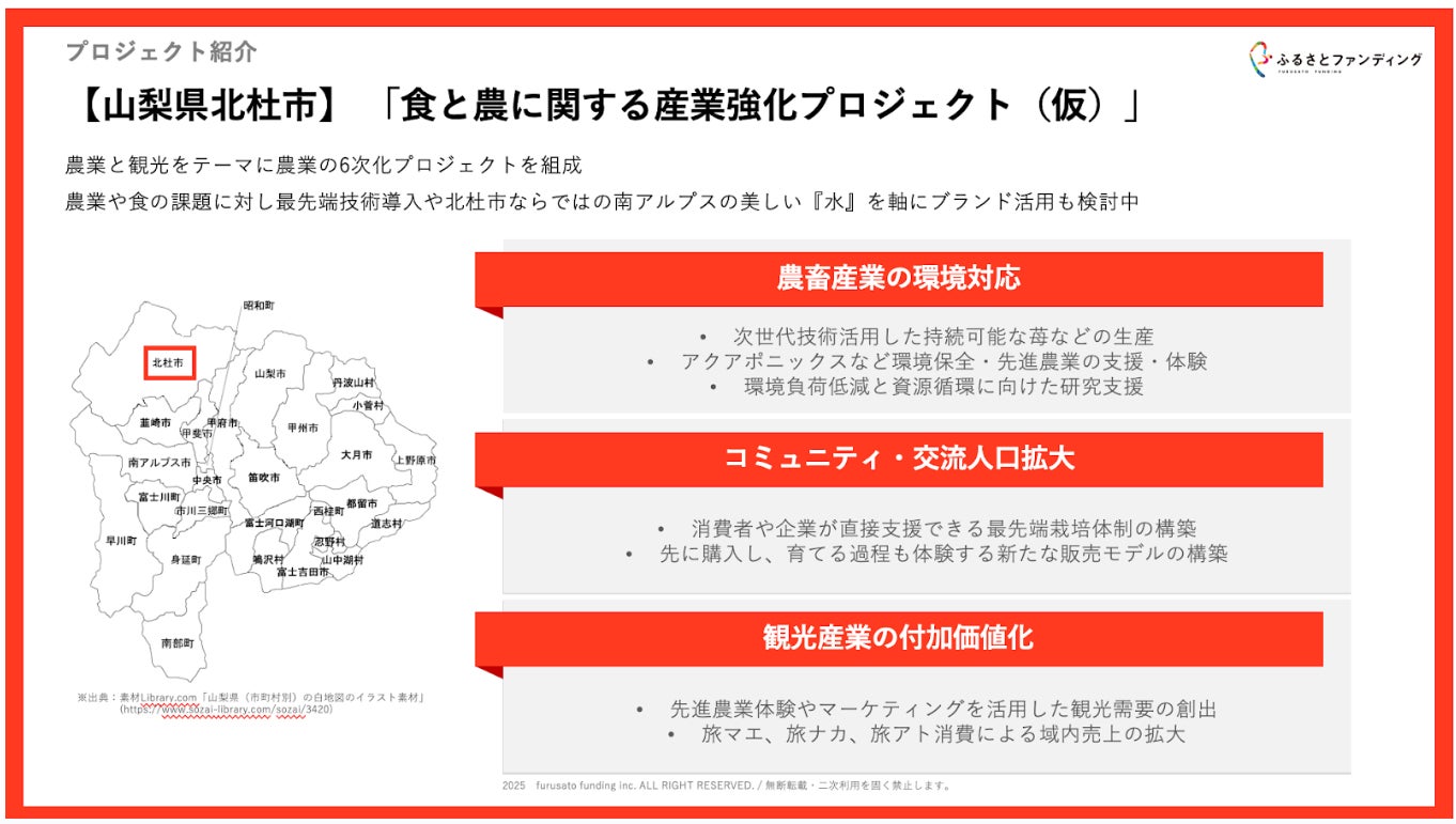 2025年7月より山梨県北杜市で開始される「食と農に関する産業強化プロジェクト(仮)」に対して、株式会社MacbeePlanet(代表取締役社長:千葉 知裕、本社:東京都渋谷区、証券コード:7095)のグループ各社より「地方創生応援税制(企業版ふるさと納税)」を通してご支援をいただきました。